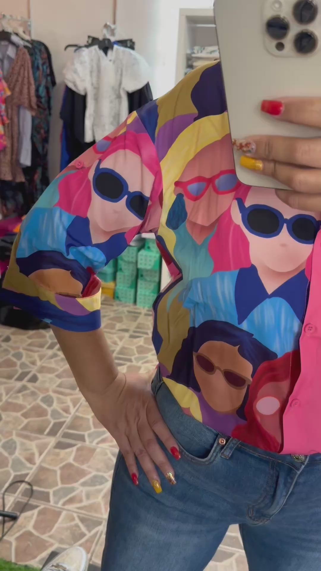 BUTTON DOWN COLOR BLOCK GRAPHIC SHIRT